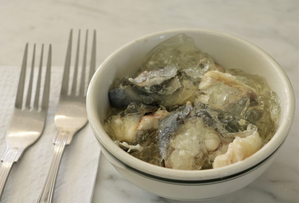 In Victorian times, the Thames was home to a vast population of European eels – the only fish capable of surviving in the foul, polluted waters filled with waste and sewage. The fish, chopped up with its skin, was boiled in a spiced broth with vinegar, nutmeg, and lemon. Being fatty and gelatinous, the eel released collagen into the liquid, which turned to jelly once cooled. Served cold with vinegar, salt, and white pepper, it became an iconic dish of the East End.