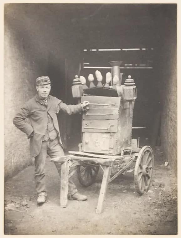 Equally popular were the roasted potato stalls, open roughly from August to April. Vendors would buy large potatoes at the market, wash them, and pay a baker eight pence to roast them in their skins for about an hour and a half. The roasted potatoes were then carried home under heavy cloth, transferred into a half-open tin can, and placed in a water bath heated by a coal fire.