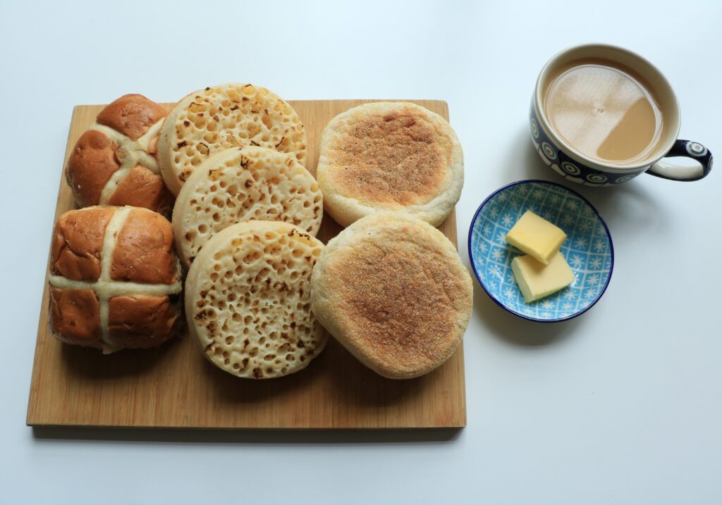 East Enders with slightly larger budgets could occasionally diversify their breakfast by buying English muffins or round, soda-leavened yeast cakes known as crumpets from street vendors. Both were served with butter and, for an extra charge, jam. During Easter, the hot cross bun – sweet, spiced, and dotted with raisins or currants, marked with a symbolic cross – was a seasonal favourite.