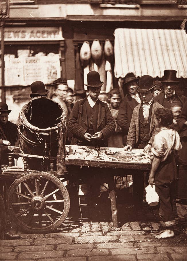 During the day, London’s poor turned to quick and cheap snacks, replacing the morning coffee carts at street corners. The cheapest – and therefore most popular – were seafood and shellfish caught near the Thames estuary. Among the best-selling snacks were cockles (heart-shaped clams) and winkles (sea snails).