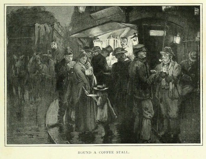 The entire stall consisted of a cart fitted with several tin containers of hot drink, kept at temperature by a small coal fire, and a set of mugs for customers. The coffee itself was of poor quality – half coffee, half chicory – and was boiled with peeled carrots to give it a touch of sweetness. It was cheap, and therefore immensely popular. For one penny, one could buy a small cup of coffee and two slices of bread and butter.